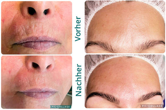 Im oberen Bild sehen Sie den Effekt sehr deutlich. Die Haut insgesamt kann dadurch gestrafft werden.